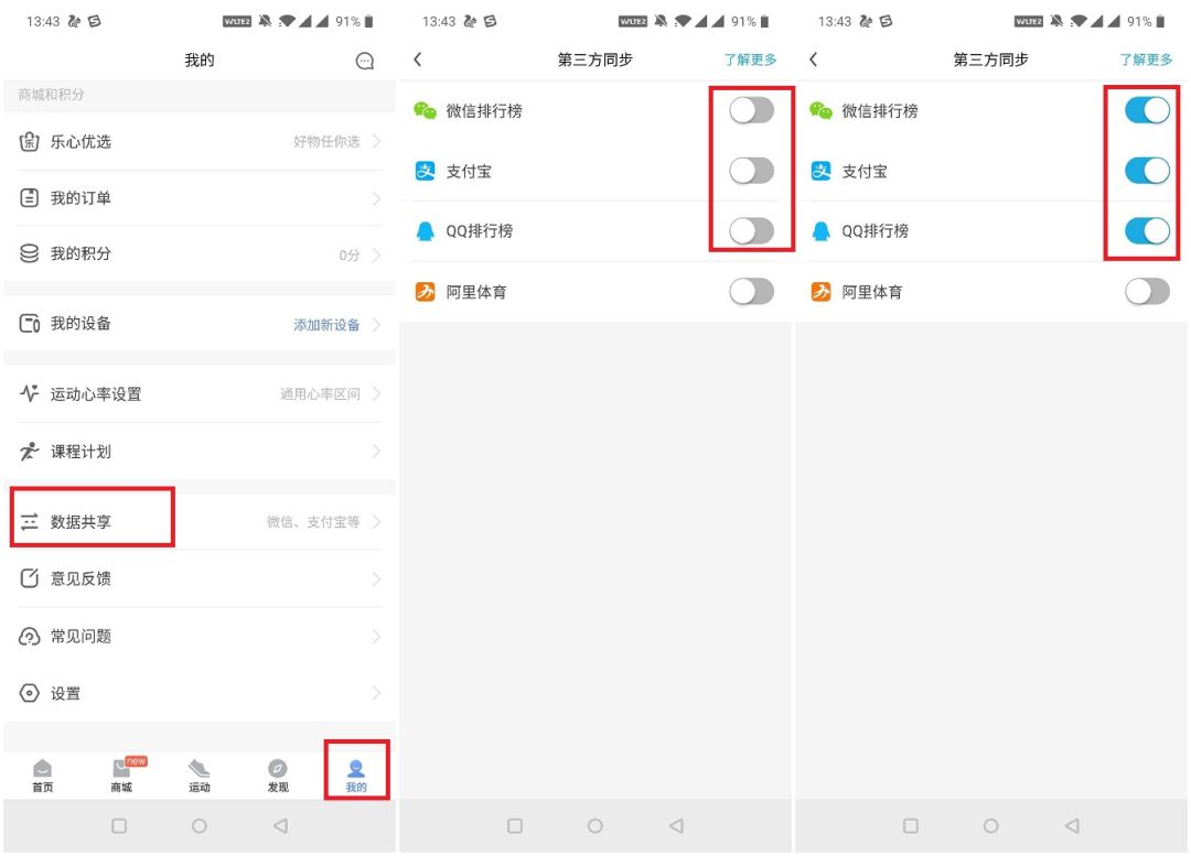 3.接下来要将乐心健康的步数同步到微信/QQ/支付宝里面。打开乐心健康,进入「我的-数据共享」