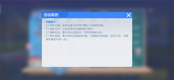 当我们的浇水次数达到3次、6次、9次、12次时,可分别获得酷币*50、酷币*100、神秘礼盒一个、捧花气球*20。