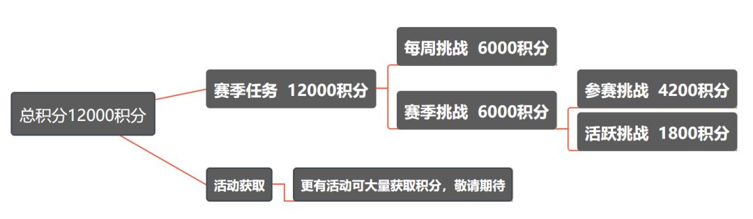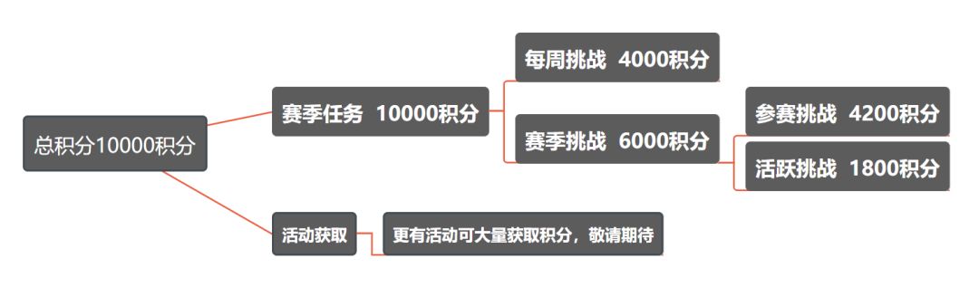 根据上面的计算,把赛季挑战全部完成,共可得到的积分为4000+4200+1800=10000积分。