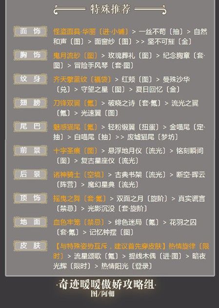 皮 肤:【与特殊姿势互斥,建议首先穿皮肤】热情旋律〔限时〕> 流星颂歌〔氪〕> 提线木偶〔进·图〕> 暗夜光辉〔限时〕> 热情阳光〔登录〕