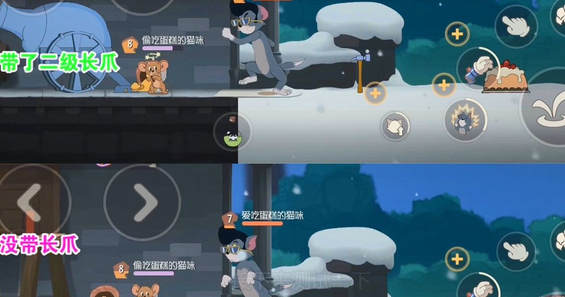 这一次我还是打算,进行分屏操作,上半边是带了二级长爪,下半边是没带长爪的,大家可以看见,我的猫咪,都是站在相同的位置,而老鼠的话,我则是让他们,站在同一条缝那里测试,结果证明,这个距离猫都是可以,打到老鼠的,测完这个位置,我让老鼠,再往前移动一下,看看能否打到老鼠,结果证明,即使是带了长爪的猫都,是没办法打到老鼠的,看来我的2级长爪,增加的攻击距离,应该还要短一点。