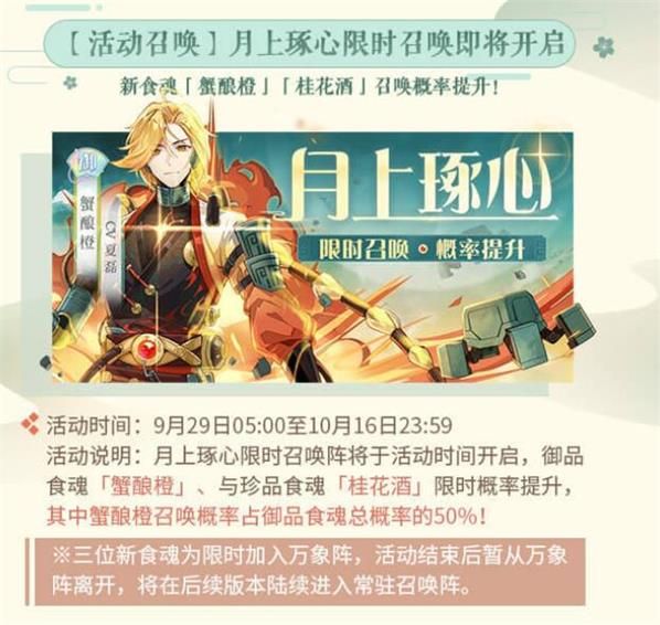 获取蟹酿橙的最基础的手段自然还是提前攒好魂芯和金玉乃至钞票,等着活动池开启之后进行大量的抽取以盼出货。如有条件甚至可考虑直接砸钱砸到满突。