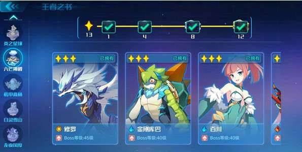 王者之书的另外一项功能则和上方的进度条有关,通过挑战图中的boss可以取得星星,而累计达到一定数量后即可取得对应阶段的成就奖励。