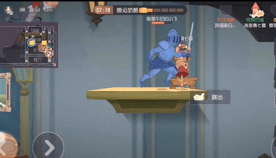 咦,这个大花瓶怎么打中了盔甲人,咦,这个盔甲人怎么在打我们,是猫咪是猫咪,快跑,额,你这队友怕不是卧底哦,搞半天的盔甲,然后直接送给猫了,真无语,队友倒地了,猫咪出来直接抓鼠跑了,哈哈哈,盔甲人是我的了,这些人就是不懂,你穿上盔甲,那就不要脱掉,一定要被敌人打烂掉,不然的话就是给敌人使用的,这个机甲什么都好,就是弹跳力太低了,还好这里是有个沙发,利用沙发就可以轻松的跳上去,对着牛仔汤姆就是一顿猛砍。
