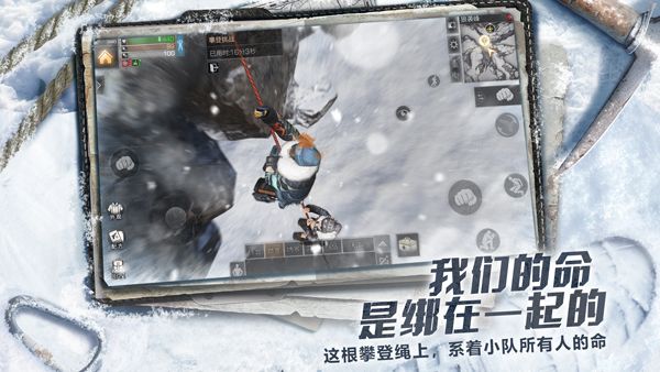 如同《攀登者》里并肩攀登珠峰的队员一样,悬崖峭壁难以攀爬,唯有先将队友送到平台之上,放下绳索将下面的队友拉上峭壁。相信队友,合力攀登,你们才能越过天堑;积雪厚重,行走移动速度大幅降低,无法奔跑。幸存者必须装备专业登山杖,和队友互相搀扶,跋涉前行。