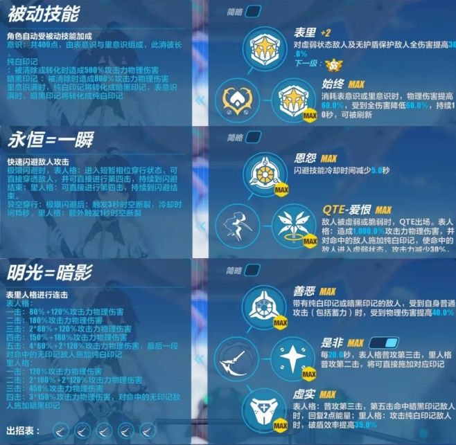 表人格击中后会使敌人进入虚弱状态,里人格击中敌人后此次攻击及之后的12秒内破盾效率提升。