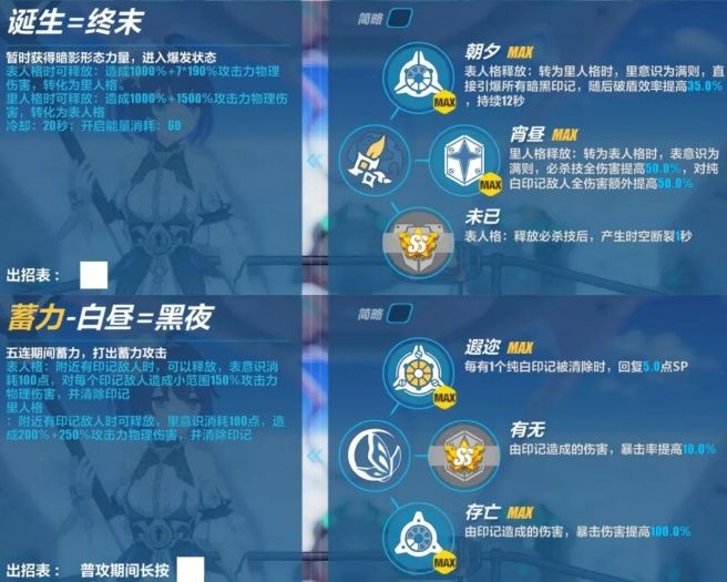 在表人格下普攻施加纯白标记,蓄力清除标记造成伤害的同时积攒sp。当表意识消耗完时,开启大招将转化的暗黑标记引爆,同时进入里人格状态。