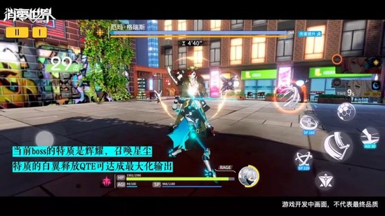 虚弱值与QTE是VGAME中很重要的一个战斗体系,在游戏中,大部分敌人的血条下面都有一个橙黄色的“虚弱值”的积蓄条。通过不断的对敌人攻击,会使虚弱值逐渐积蓄满,一旦虚弱值积蓄满,敌人就会进入虚弱状态,此状态下的敌人会立刻停止一切行动,并且玩家可以操控白翼对处于虚弱状态的敌人进行QTE攻击。使用特定的技能组合可以加快敌人的虚弱值积蓄——这里可以多查阅一下游戏内的《白翼手册》。