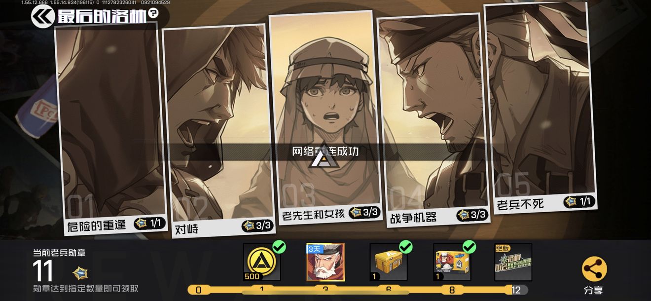 分享失败的话,重新分享下,再返回游戏就有了,刚好够12个老兵勋章。是个小bug,要麻烦重新分享一次,然后点“返回游戏”,就可以领取。