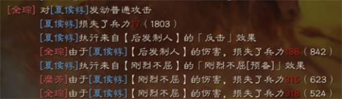 这个指挥技能触发得是兵刃伤害,一不小心打到我们得夏侯大人,我们夏侯大人得暴脾气,刚烈不屈,瞬间来了,让你打我,虽然是吕布和全宗在决斗中,但是刘封得出场触发兵刃伤害打到了夏侯大人,夏侯大人立马反击殴打2人,伤害十分可观。这意味这夏侯技能在这个兵刃基础上可以进行各种反击,而在前期开荒种,绝大多数是兵刃伤害,那么暴虐下得夏侯惇可以打出高额得伤害。