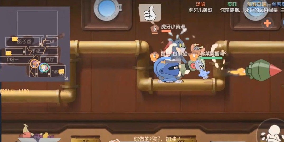 没想到最后还是剑客杰瑞上的天,话说这个地方时什么情况,明明再跑,但是角色腿洞人不动,还有这个机械爪,明明跳上去了,下来的时候也没在范围里面,竟然还被拉过去了,这猫怕不是开挂哟,怕了怕了,赶紧打洞撤退,不然这爪子太变态了,简直比平底锅还强。