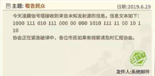 在早先六月间玩家就已经接受到过一次来自未知发射源的邮件,当时的密码解出之后发现是指波罗斯即将到来。