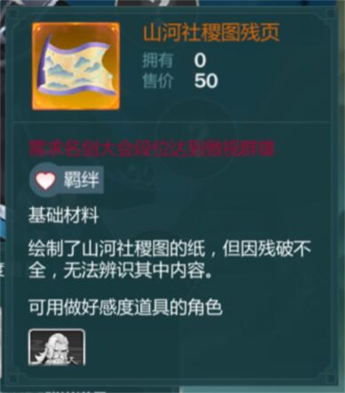 少侠在参与名剑大会,达到十二段【傲视群雄】时,即可解锁唐简好感度道具【山河社稷图残页】,之后可前往【大侠墓】中寻找唐简拜访!