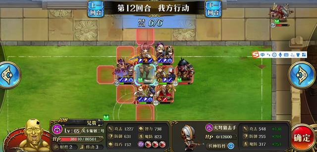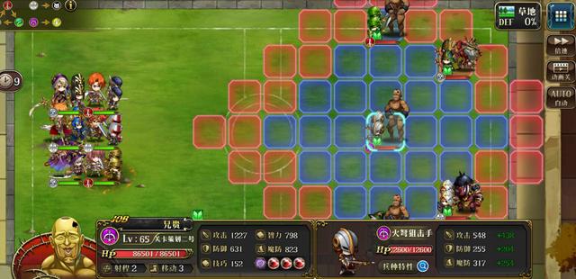 由于回合优先,选择了让雷丁第一回合就进入对方攻击范围。这样第二回合,波波可以直接大地震到对方大部分人。艾尔文追着步兵兄贵砍就行了,在块半血的时候稍微注意下,由于我选择了双坦阵容,所以在步兵兄贵血线低于50%的之后选择了上图站位方式,这样站位就可以避免步兵兄贵无视护卫秒人。处理完步兵兄贵后边,就是想办法为杀那几个远程单位。