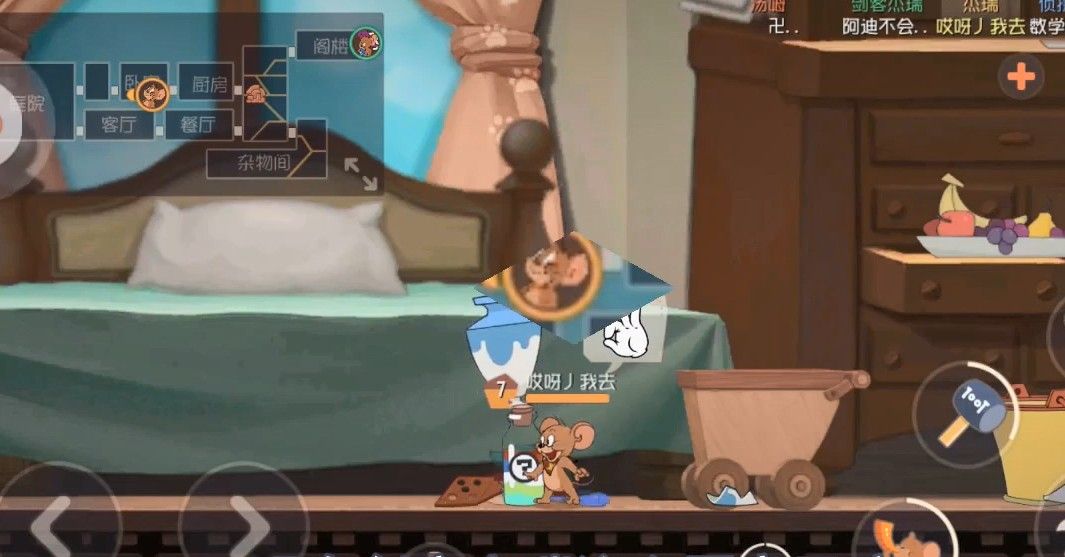 不过说实话,现在剑客杰瑞这么厉害了嘛,两个杰瑞就可以把猫咪打这么惨了,整把除了打洞,其余时间,都没看到过猫咪,说起这个洞也是脑阔疼,就在楼梯中间,道具道具没多少,只能一个个房间搜了,简直了,还有一点就是猫咪如果在洞旁边,拿过来的道具扔过去也没用,不晓得锤子能锤洞不,不然应该很厉害吧。