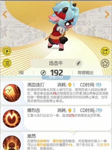 迅击牛是初始形态,当他进化觉醒完成后就是牛金牛,是星宿妖灵之一,所以获取方法目前还不知道哦。他的技能消耗很少并且一技能CD只有1秒,也就是说只要有豆他就可以一直打下去,二技能的CD比较长,但是伤害很高,被动技能可以使二技能变成瞬发,并且一技能每命中一次就能提升一次二技能的伤害,叠加6层后可以打出爆炸伤害。