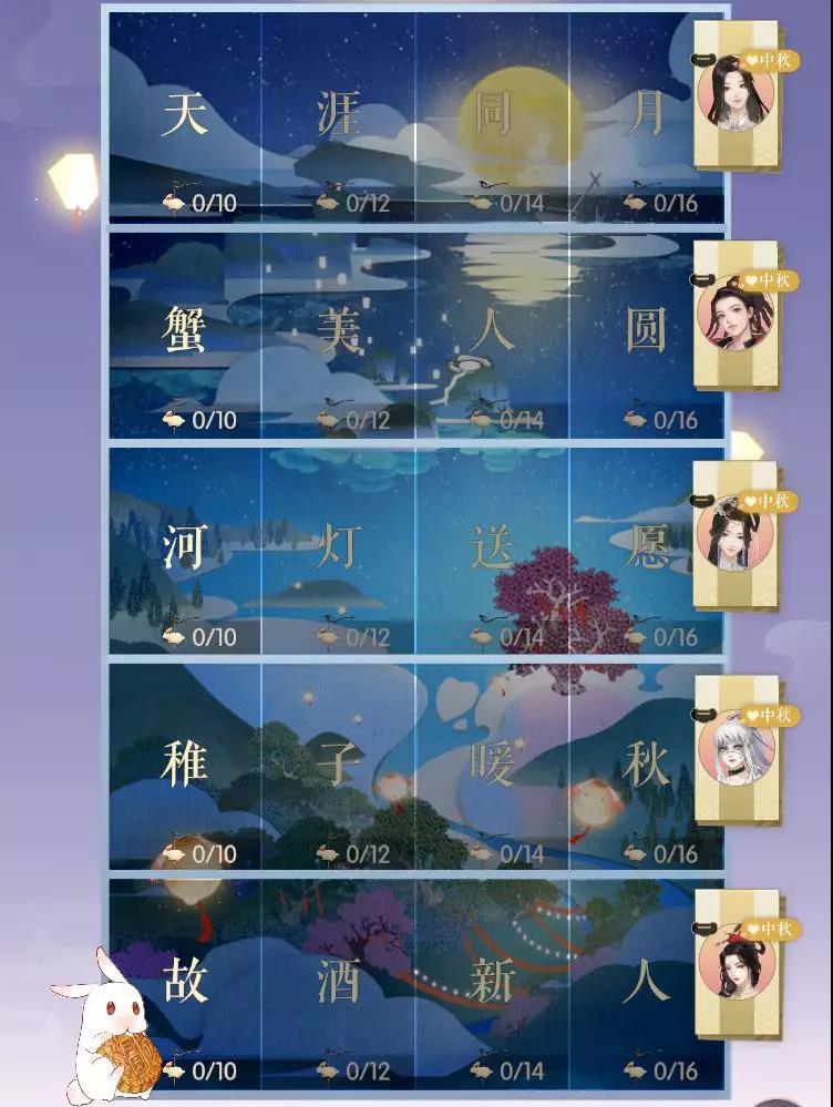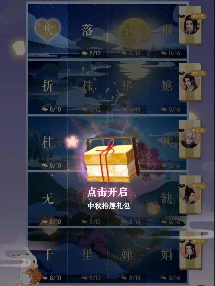 云中谁寄锦书来?人月两圆,更要锦上添花,全新角色专属语音书信,将在节日活动【中秋拾趣】上线。秉承《遇见逆水寒》一贯佛系养肝的风格,【中秋拾趣】活动不耗阅历即可进行,通过关卡探索获得道具点亮拼图,完成任意一行就能收到中秋语音书信和节日礼包。