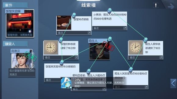 10、把流浪汉头像按住,拖到线索墙中间,然后线索的图标也按住,拖到线索墙里排列,图标不是有2个圆点,点击一下圆点,把流浪汉,跟那5个线索连起来,确认解锁新嫌疑人。