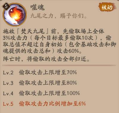 然后再来看看偷取的具体数值,全体3%(满技能之后6%)的攻击力,每个目标最多偷取10次,估计是怕“长久战”,偷取总值不超过自身初始(包括基础攻击和御魂提供的攻击总和)攻击60%(满技能后提升至100%)。关键是这是偷取场上全体的攻击力,不论友方敌方,统统都是“我”的?