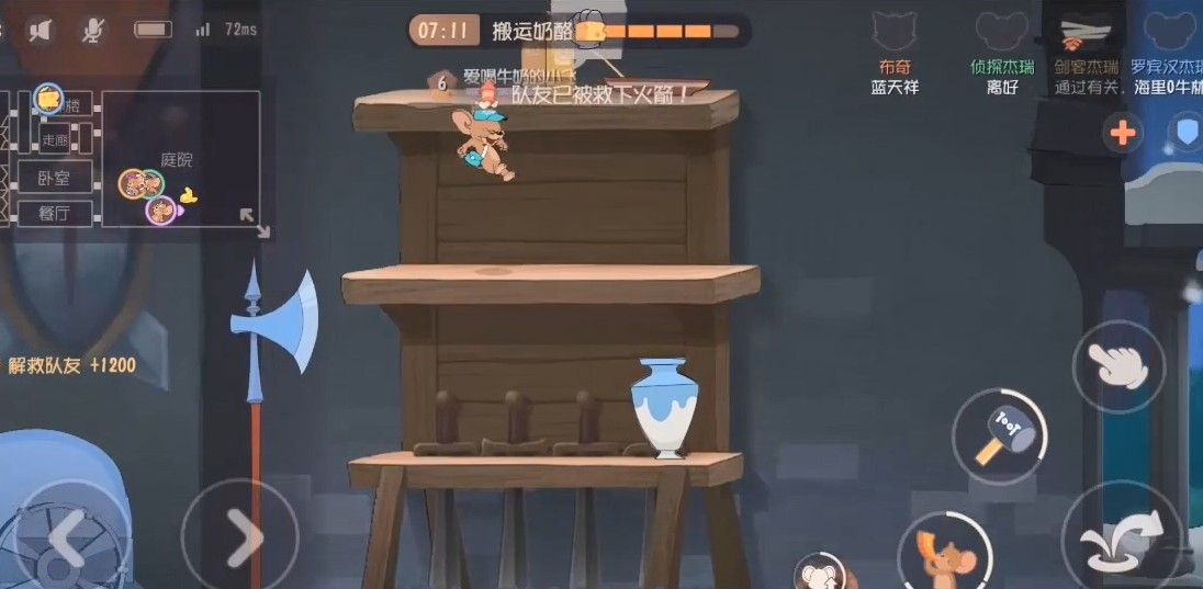 突然喝个神秘药水,变成了比利鼠,还好是黑鼠追上去就是一顿猛敲,直接敲晕,不愧是黑鼠,我还从来没有在比利鼠的时候敲晕过猫,你是第一个,谁知道还是救不了队友,我的药水效果消失,队友变成比利鼠又来了,那我就去推奶酪了,其实最佳MVP还是斯派克。