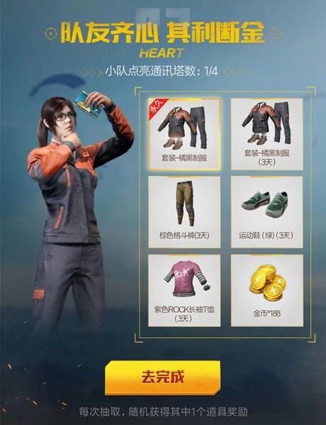 从活动规则处,我们可以看到想要橘黑制服有3天和永久之分,但它们的获取途径是一样的。需要我们邀请3位好友组队并点亮4处通讯塔或者我们作为队友参与其他组队一次,都可以获得一次抽奖;并随机获得下图中的1个道具奖励。