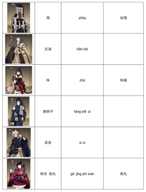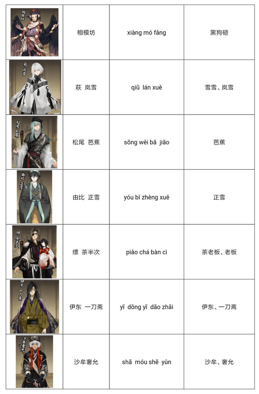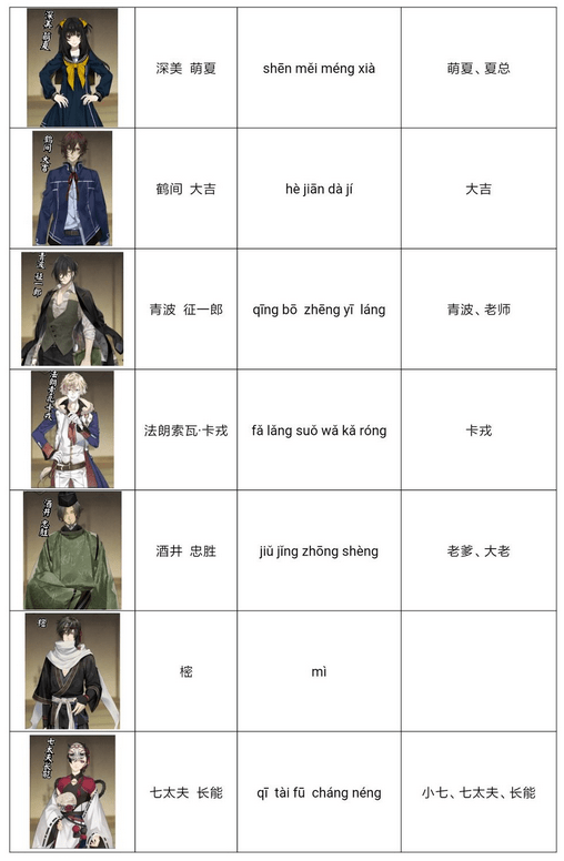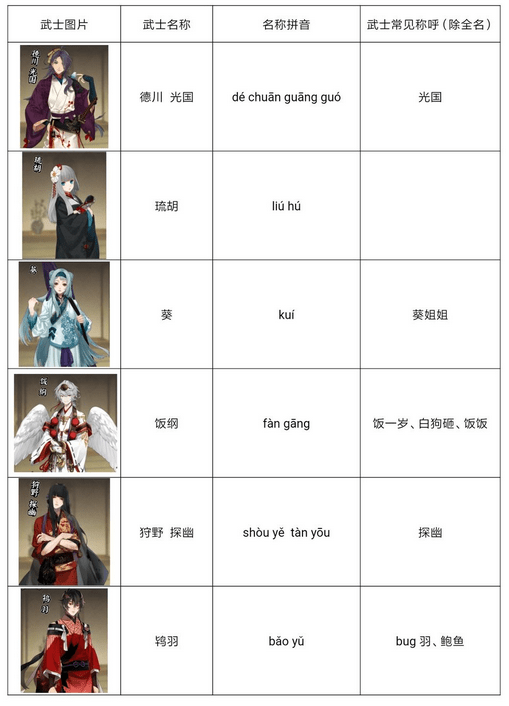 因为字体的缘故,有些小伙伴可能会看错武士的名字~这里列出来了武士们的全名以及选取了一些常见的称呼,仅供参考小伙伴们快来和阿攻分享一下自己对武士们的爱称呀~