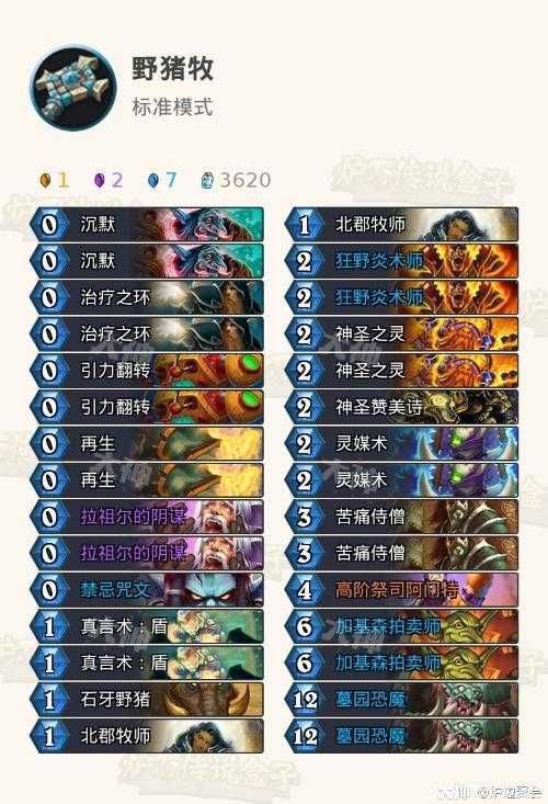 新版野猪牧,其实看构筑更像是上版本大厨牧外挂野猪斩杀组件(什么?你问我为啥不带大厨?元气骑需要带大厨吗?)。这套牌看到几个国外主播构筑都一样,在没有实战测试的情况下应该是目前不错的选择。制胜思路有两种:一种是打快攻或者解场能力差的卡组,可以按大厨牧的打法,用北郡,苦痛过牌,炎术士处理快攻,加基森启动刷到0费恐魔,然后阿门特翻倍恐魔灵媒术恐魔造出绝望之墙劝退。另一种就是野猪的斩杀,适合对付控制卡组等解场能力强的对手,阿门特盾翻倍小野菊翻转斩杀,具体斩杀线为: