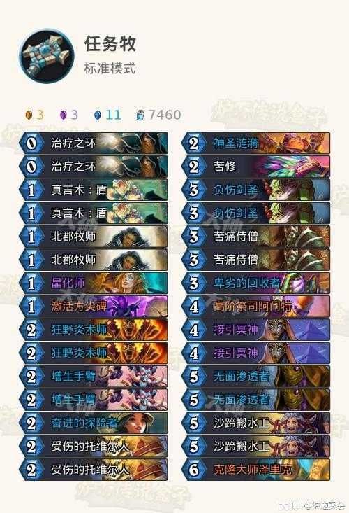 中规中矩的中速套牌,靠做完任务用技能BUFF滚雪球取胜。这是鄙人参考了几个构筑后的微调版本,这个版本没有带心火,带一张晶化师可以在不损血的情况下加快做任务进度。一张223探险者是任务体系套牌优秀的前期随从(没有带两张一个是卡位紧,再一个任务做完了就成了白板)。这套牌过牌手段丰富:北郡可以配合治疗之环,炎术士可以配合苦痛,年迈的牧师会找到更多的过牌方案,不过毕竟这套牌没有otk元素,因此过牌时要慎重。低费随从较多,前期基本不愁卡手。阿门特拍下以后可以用增生手臂或奖励技能BUFF完再拍其他随从造出进击的巨人雄兵。带一张涟漪加强AOE能力同时加快做任务进度。