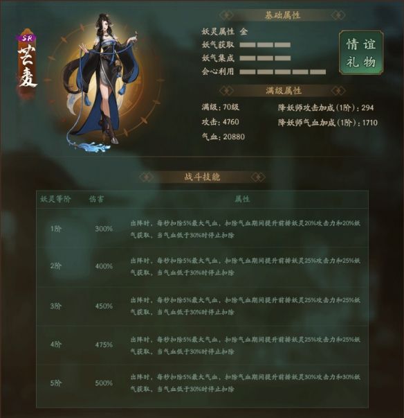 妖灵达到5阶时,每秒扣除5%最大气血,扣除气血期间提升前排妖灵30%攻击力和30%妖气获取,当气血低于30%时停止扣除。