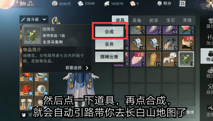 将这些东西从包裹里面取出来,然后点击合成。角色就会自动寻路去长白山啦