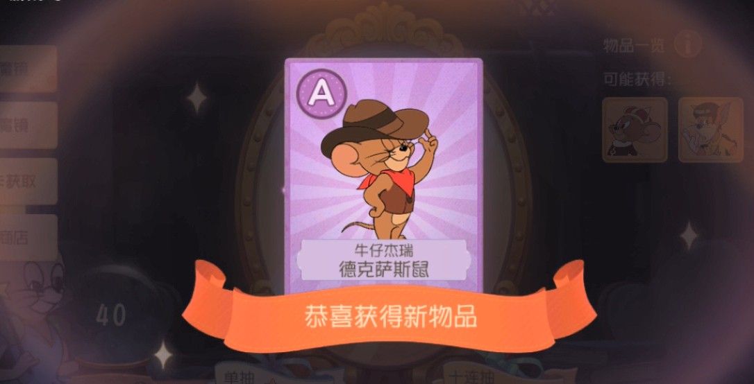 后面又去搞了一颗心,再看看,我就不信今天这么非,写个欧皇本皇试试,哎哟不错哦,牛仔杰瑞的A皮,德克萨斯鼠,我发现牛仔系列的皮肤真的容易出。