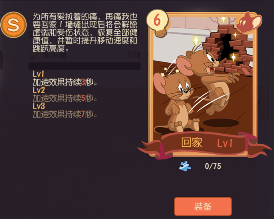 当墙缝出现,胜利在望时,对家的思念将激发出老鼠的潜能!配备“回家”知识卡的老鼠,在墙缝出现后可解除所有虚弱和受伤状态,恢复全部健康值,并暂时提升移动速度和跳跃高度——谁也阻止不了一只老鼠回家的路!