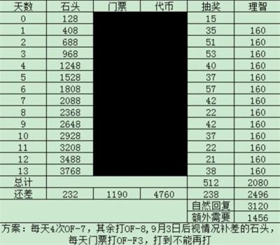 根据既定方案,想要抽完固定池还差238次,最后换算为门票约1190张,加上差的232石头,共需要2496理智,每天日常8次活动本(4次OF-7,4次OF-8)是160理智,扣除自然回复的3120理智,还需要额外的1456理智,各位刀客塔可视情况碎石。