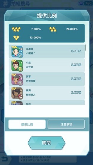 在最初的教程阶段,玩家将会陆续收入三星的小刚和小霞作为初始队员,而后还会在第一章取得五星的鸣依(配藤藤蛇),以及在首次教学抽取中会单抽出小茜(配大奶罐)。