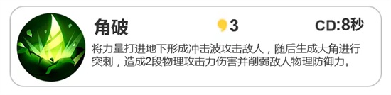 技能一:角破的输出伤害一般,但它主要的效果是进行物理减防,且能持续时间几秒,期间可切换其他妖灵进行输出,也可以继续切换二技能进行输出。