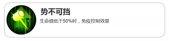 被动技能:势不可挡,在生命不足50%时,无视控制效果,眩晕、沉默、禁锢等一些控制效果对该游戏无效,仍然可以继续输出。