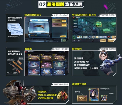 8月30日至9月30日,“收藏家福利”、“生化双倍积分任务”上线。玩家在收藏家系统可参与“开学系列4选1拿永久”活动,欢乐教尺、黑板擦、AK47-马赛克等开学系列专属武器等你收藏;与此同时,玩家可凭借生化专属任务获得双倍积分,轻松实现事半功倍。