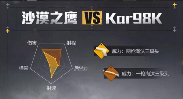在对比之后所得出的结果就是,沙漠之鹰比上不足,比下有余。伤害比M416高,射速没M416快。伤害没98K高,但是射速比98k。