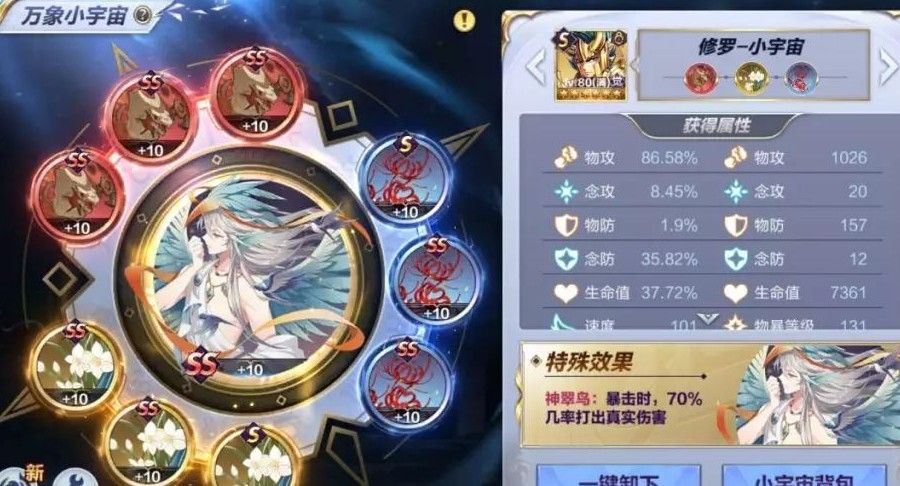 1小宇宙搭配:修罗的小宇宙推荐着重于物攻、速度、生命值的培养,因为当前修罗的伤害成长系数较高,容易被集火,所以生命值也要放在重点。