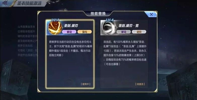 要说圣衣系统中的赢家,摩羯座修罗算是其中非常突出的一个了。原本需要通过击杀才能提高圣剑乱舞段数的设定在技能觉醒后触发条件仅为使用攻击即可提升,上限也提升到了总计13段乱舞伤害,并可以在产生击杀后提升10%物暴效果(上限3次)且每段攻击都有75%的概率将目标击退(可击出藤蔓)。一个技能觉醒直接让修罗的战斗能力上升了好几个档次,在后期几乎是没有人可以抗住修罗的13段连击。