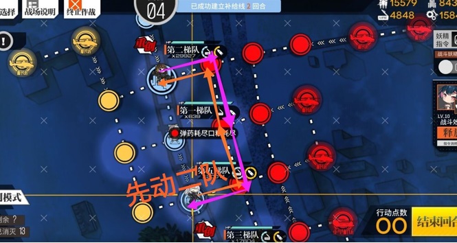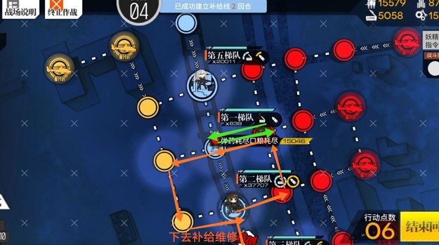 第三回合:二队ar如图移动(绕一圈)再和rf换位两次补充弹药修复回到原位 狗粮也回到原位(因为忘记截图所以用了第四回合开始的图大家当成第三回合图使用无碍)