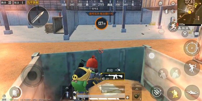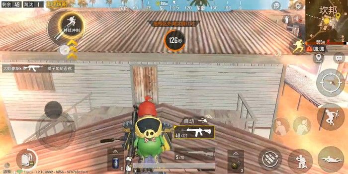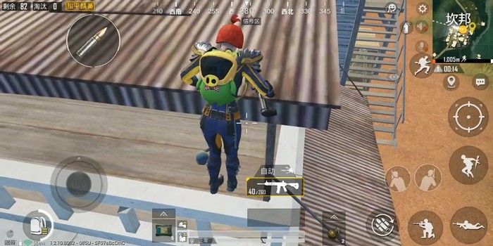 我们搜完落点的房子以后装备就已经基本成型了,就可以开始清点的计划了,我们出来以后往西北方向走,也就是地图上的左上边,来到这个位置,利用围墙先来到这个房子的房顶先观察一下。确定周围安全以后继续往西北走,然后通过箱子跳到这个阳台外面,背对阳台可以跳到阳台护栏上,然后回头就可以翻到楼顶,然后就可以在这一排房顶之间来回转移了,利用这排房子就可以观察到坎邦一半的区域了。
