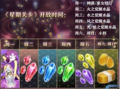 神酒水晶等材料我们都可以通过主页--活动--曜日关卡获得,这里需要注意的是,神酒没有属性限制,但是各色水晶有不同,周一可获得各个大小神酒,周二至周五每日可获得不同颜色水晶,周六周日可获得小判。同样一周只有一次机会所以可不要错过时间。