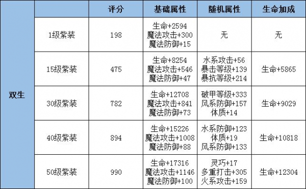 所有属性均为紫色属性时可以激活额外生命加成,所有属性均为橙色时可以激活额外属性魔法攻击加成,所有属性均为金色时可以激活额外属性某一系属性(随机)攻击加成。此外只有40级以上紫色及更高品质的装备中才有一定几率会带有龙语,带有龙语的装备的名字前会有“龙语”作为前缀。紫色装备品质和可获得属性如上图:(随机属性根据每个装备的不同而定,替换更高级装备时可从低级装备上转移)