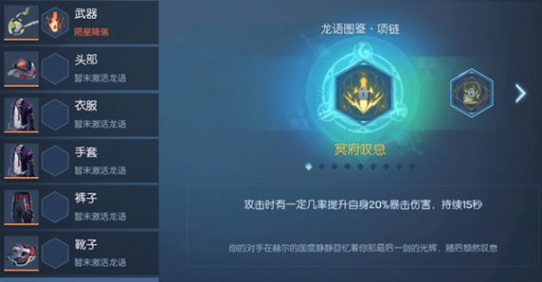 武器可以分为两大类:一种是可以激活龙语的装备;一种是不可以激活龙语的装备。而武器又分四种品质:最低端的绿色品质、中端的蓝色品质、高级的紫色品质、特级的橙色品质。四种品质的基础属性都是为角色添加生命、魔法攻击、魔法防御三种属性,紫色及以上品质装备拥有多个随机属性(绿色、蓝色、紫色、橙色、金色)。