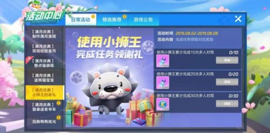 这个活动不在主界面的右侧,而是在左上角,有个“狮王感恩”按钮,点击就可以进入小狮子对应的活动窗口。在这里们可以通过抚摸来获得小狮子的好感,当好感度累积到40就可以领取永久小狮子。右侧可以看到每日任务,全部完成每天最多可以获得4次抚摸次数,也就是4点好感度。