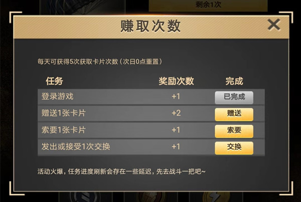 登录游戏、索要1张卡片、发出或接受1次交换都可以获得1次卡片获取次数。而赠送1张卡片可以获得2次卡片获取次数。