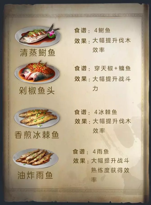 图中,则是新增的11种鱼类所对应的11种食物。比如说剁椒鱼头,就可以大幅提升战斗力。大家可以对应上图中的食谱,来制作所需要的食物哦。