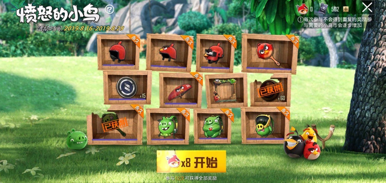 奖励:愤怒小鸟一级头、愤怒小鸟二级头、愤怒小鸟三级头、愤怒小鸟平底锅、愤怒小鸟降落伞、绿色头像框、绿猪平底锅、服装币*60、绿猪1级包、绿猪2级包、绿猪3级包。