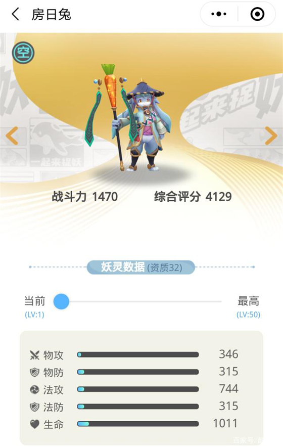 进化路径:萌卜兔-苦行兔-房日兔。游戏中的定位为空系法术输出,可以克制木、毒属性妖灵,被风、仙属性克制。